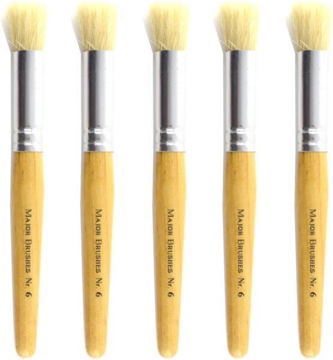 Speciale sjabloonkwast gemaakt van kort wit varkenshaar ideaal om te gebruiken bij verf sjablonen. De haarbundel is speciaal rond en kort specifiek voor te tamponeren. De totale lengte is circa 18 cm. U bekomt dus 10 stuks van deze sjabloon kwast Nr. 6.