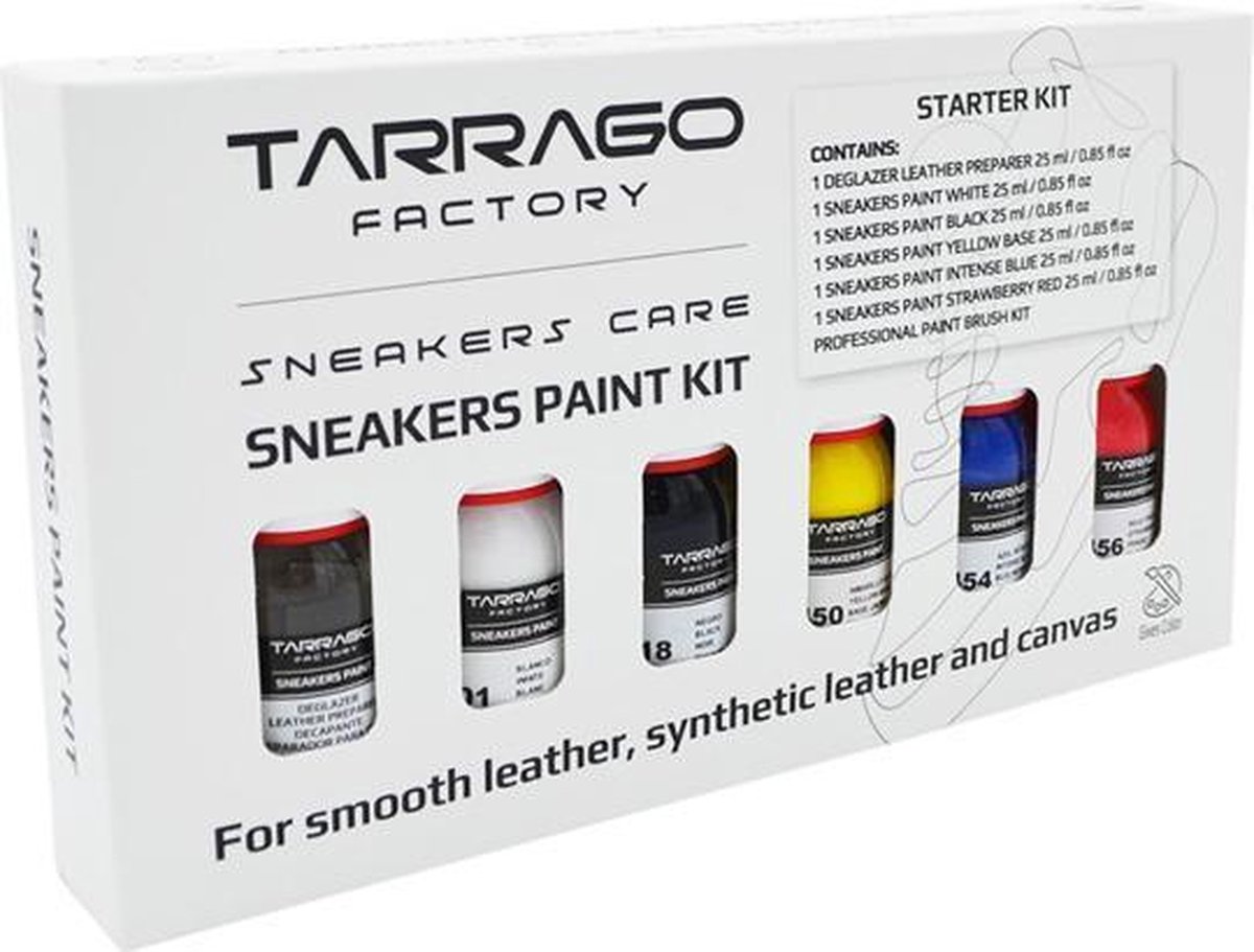 De Tarrago Sneakers Paint Kit is geschikt voor het verven van glad leer, synthetisch leer en canvas. De set bevat alles wat je nodig hebt om te beginnen met jouw eigen custom sneaker project! Alle kleuren zijn onderling met elkaar te mengen voor nog meer kleurvariaties! Alle Tarrago kleuren zijn standaard mat. Deze set bevat: 1x Wit - 25ml Leerverf 1x Zwart - 25ml Leerverf 1x Geel - 25ml Leerverf 1x Intens Blauw - 25ml Leerverf 1x Aardbei Rood - 25ml Leerverf 1x Preparer & Deglazer -25ml Voorbehandeling 5x Professionele penselen in verschillende maten