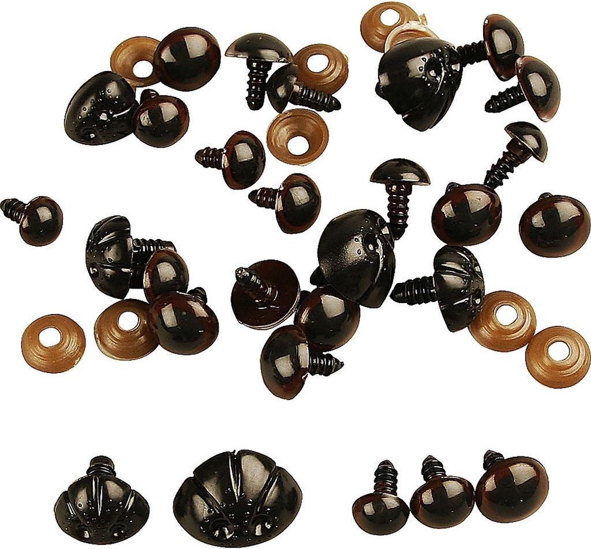 Set van teddybeer ogen en neuzen gemaakt van plastic met sluitschijf - perfect om beren tot leven te wekken.Set teddybeer ogen (10+12,5+15 mm) en neuzen (15+25 mm) gemaakt van plastic met sluitschijf.