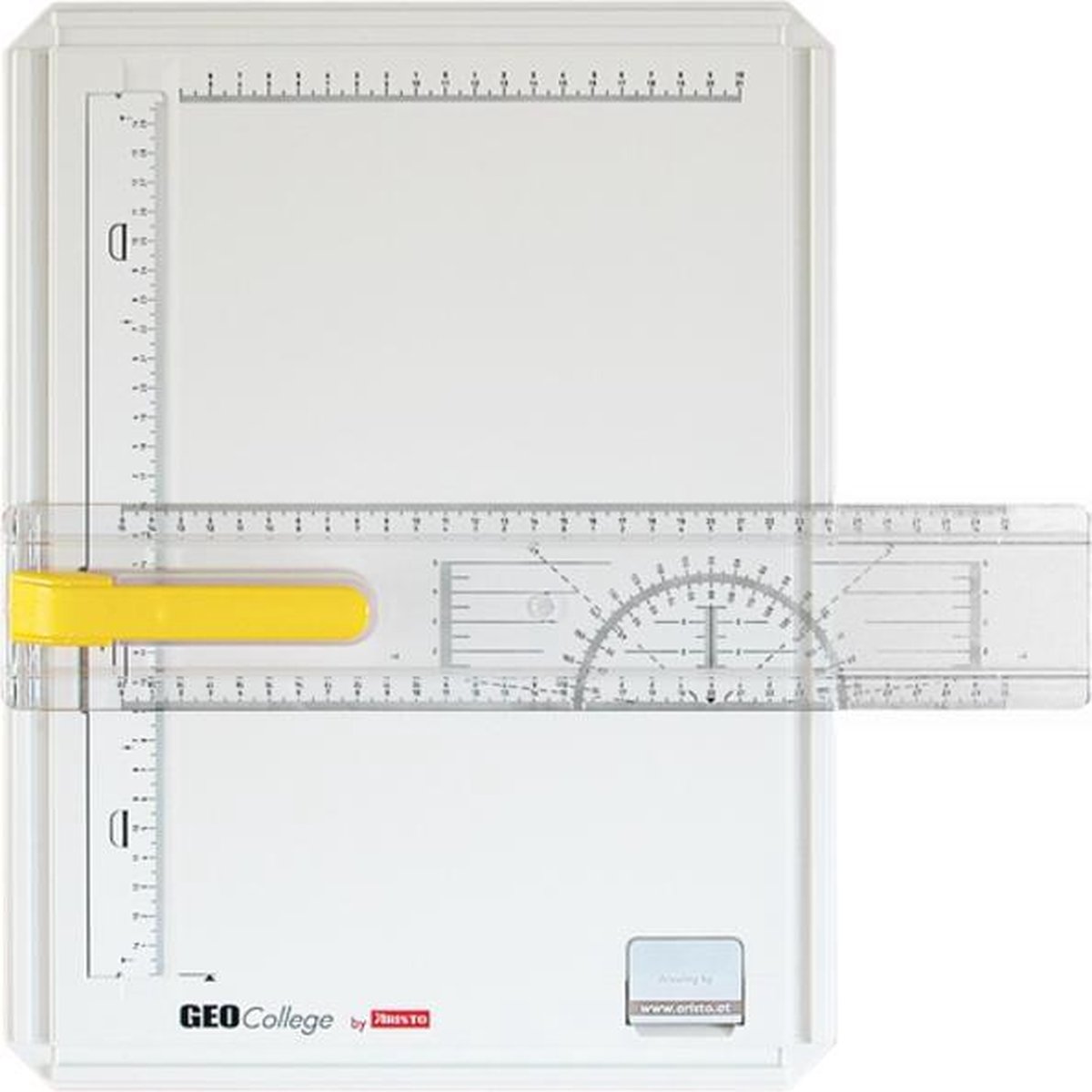 Tekenbord GeoCollege A4. Materiaal: kunststof. Kleur: wit. Te gebruiken voor A4 papierformaat. Uitvoering: schaalaanduiding voor formaat en papiermarkering, met gradenboog, magnetische papierklem met geïntegreerde drukknop en venster voor de juiste uitlijning van het papier. Met extra klem om het papier vast te zetten. Ergonomische greep met drukknop met stop-en-go mechanisme.