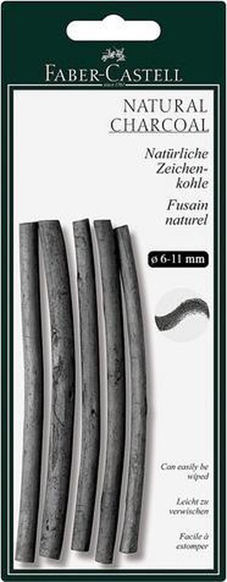 Houtskool is het oudste schets- en tekenen materiaal in de wereld. De grijs-blauwe tint glijdt zachtjes over het papier, wrijft en smeert gemakkelijk uit en kan moeiteloos worden gewist en herhaaldelijk overschreven. De blauwachtige tint heeft altijd een fascinatie gehad, zelfs bij de oude meesters. De houtskool potloden laten een veel zwarter lijn achter. Samengeperste houtskool met roet en klei geven de houtskool potloden hun diepzwarte kleur. Vet- en olievrij. Diameter 9-15mm.