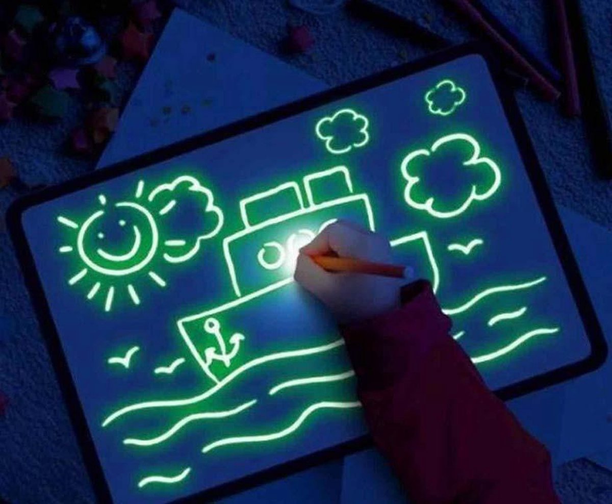 Laat tekeningen tot leven komen met dit Glow In The Dark tekenbord! Het lichtgevende glow in the dark tekenbord is een fantastisch entertainment in het donker en biedt uren lang speelplezier, voor jong en oud. Deze educatieve tekenmat helpt jouw kind met het schrijven van cijfers en letters, ontwikkelen van de creatieve geest en leert het kind om in het donker te kunnen spelen zonder angst. Teken met de bijgeleverde magische Glow In The Dark pen de meest prachtige tekeningen. De tekeningen zijn alleen zichtbaar in het donker en vervagen na circa 30 minuten weer. Maak de kamer zo donker mogelijk des te helderder de tekening. Hoe donkerder de kamer, hoe helderder de tekening. De set wordt geleverd met sjablonen van letters en cijfers, een magische pen en handleiding