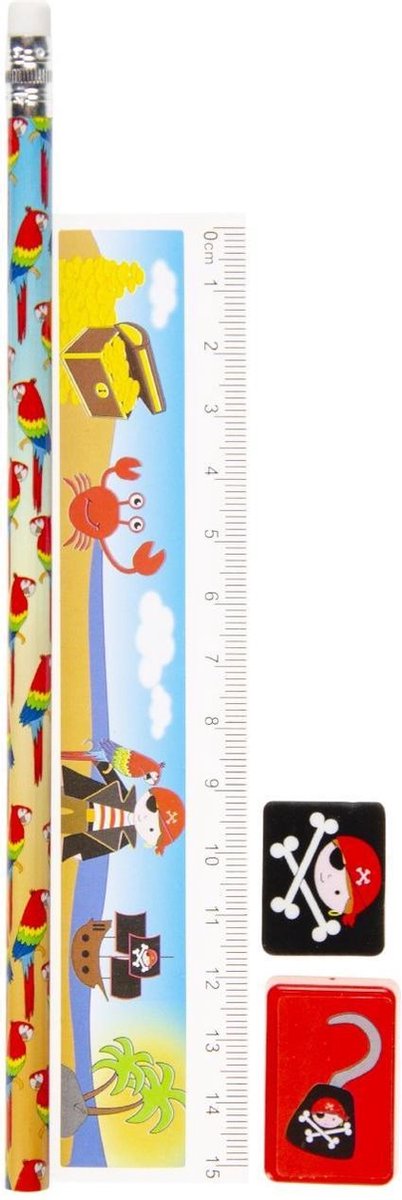 Tekenset 4-delig. Deze leuke tekenset bevat een potlood, een liniaal, een gum en een puntenslijper. Deze tekenset heeft afbeeldingen van oa een schatkist en een piratenschip. Formaat set: 25 x 7 x 1 cm. Geschikt voor kinderen vanaf 4 jaar. Tekendoos/tekenset piraat voor kinderen.