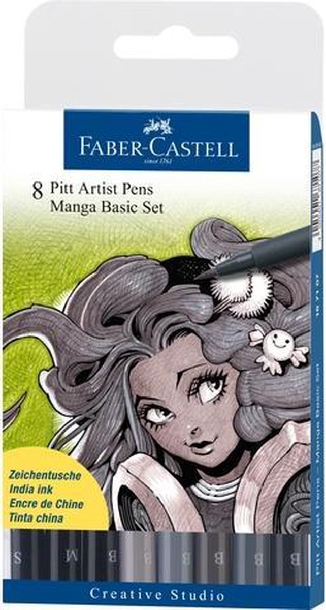 8 stuks in etui. Manga set. Schrijfbreedte B = Brush. Inkt op waterbasis. Ideaal voor schetsen, studeren en inkttekeningen. Bijzonder geschikt voor kunstenaars, ontwerpers, architecten en grafisch ontwerpers. Inkt met hoge lichtbestendigheid. De lichtbestendigheid is in elke kleur met een sterretje voorzien: *** zeer goed LB / ** goed LB. / * voldoende LB. Lange levensduur en hoog comfort. Na het drogen permanent. Sneldrogend. Vormvaste punt. Inhoud: PITT Artist Brush warmgrijs III, warmgrijs IV, Koudgrij III, koudgrjis IV, koudgrijs VI, 3 zwarte Pitt Artist Pen: Brush, Medium en Superfine.