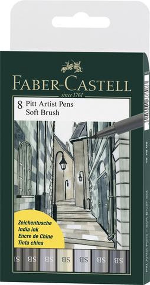 Tekenstift met brushtip voor schetsen, studies, tekeningen, opschriften, ontwerpen en lay-outs. Hoogwaardige pigmentering met een uitstekende kleurkracht, hoge lichtbestendigheid, watervast, goed inktvloed en gelijkmatige kleurafgifte. Reukvrij, zuurvrij en Ph-neutraal. Etui met 6 stuks assorti: 230 koudgrijs I, 232 koud grijs III, 233 koud grijs IV, 235 koud grijs VI, 157 indigo en 199 zwart.