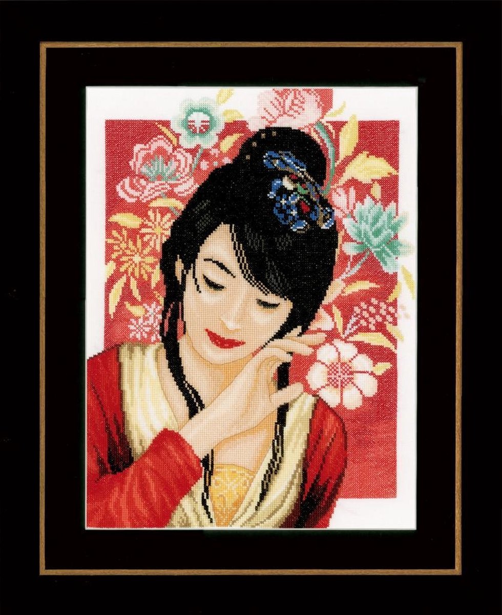 Telpakket kit Aziatisch bloemenmeisje , Steken: kruissteek, Spansteek