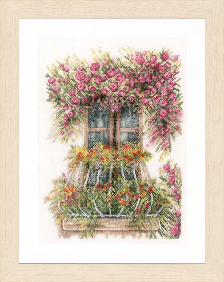 Telpakket kit Balkon met bloemen, Steken: Halve kruissteek, kruissteek