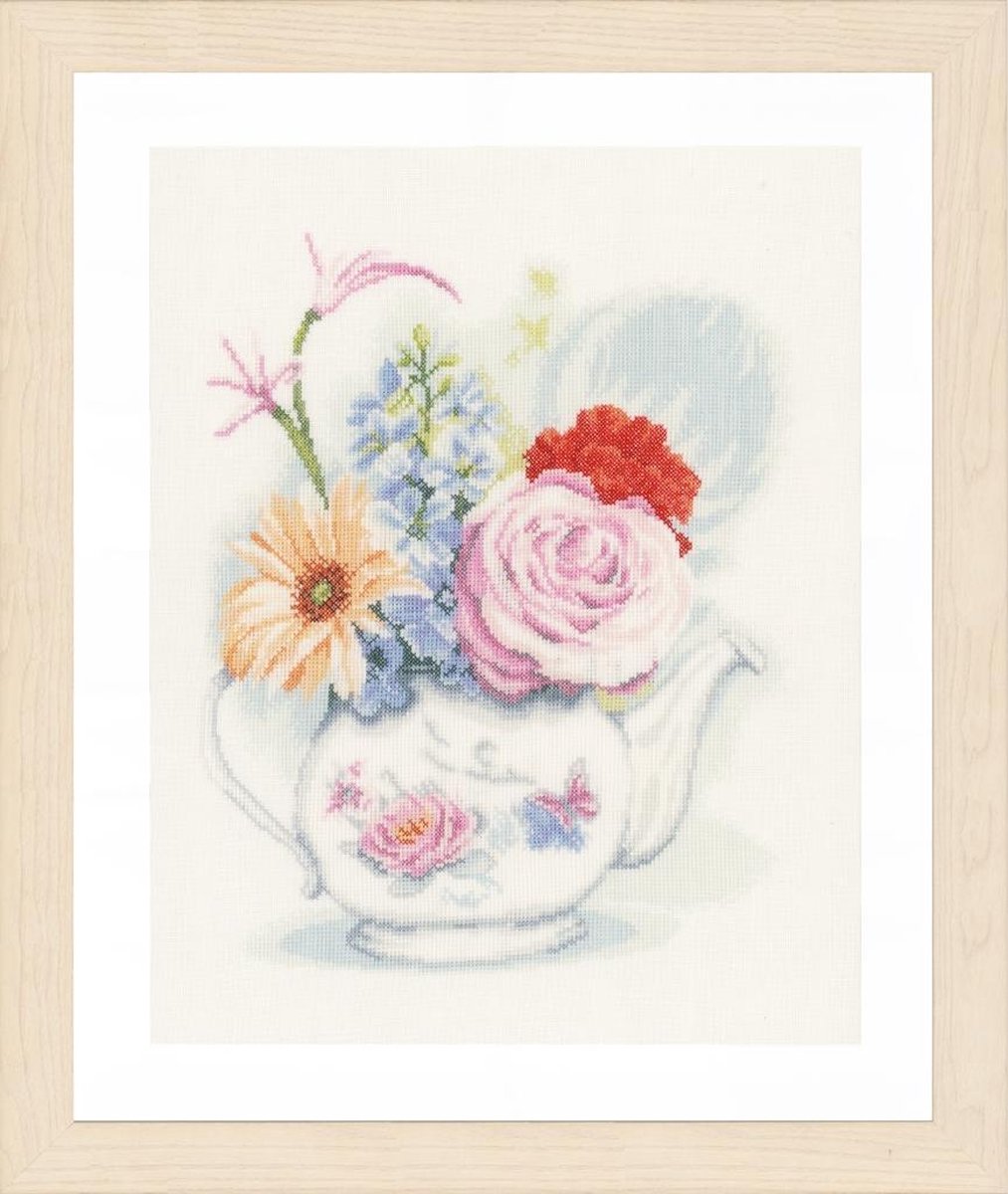 Telpakket kit Bloemen in theepot , Steken: kruissteek