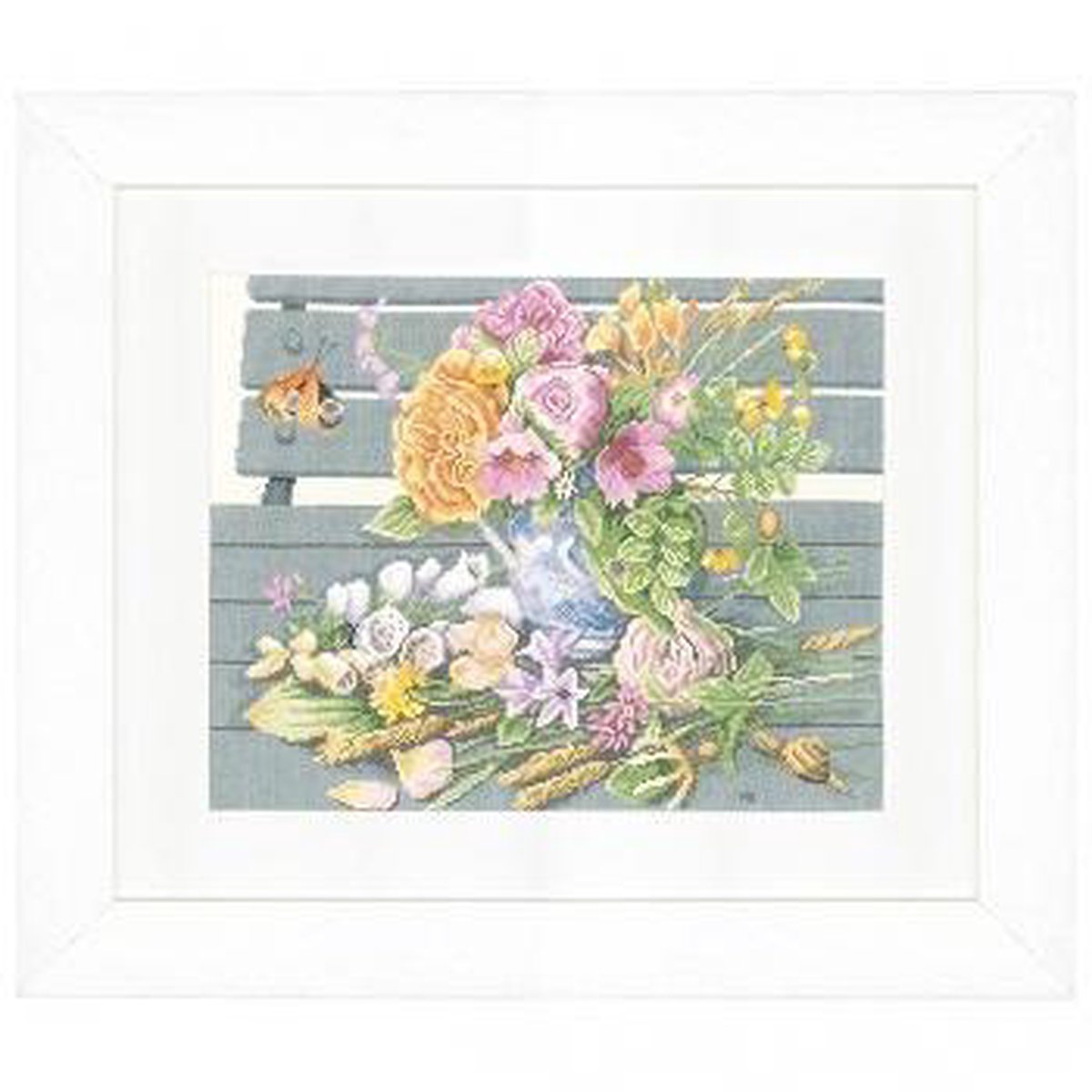 Telpakket kit Bloemen op bank , Steken: Franse Knoopsteek, Halve kruissteek, kruissteek, Spansteek, Stiksteek