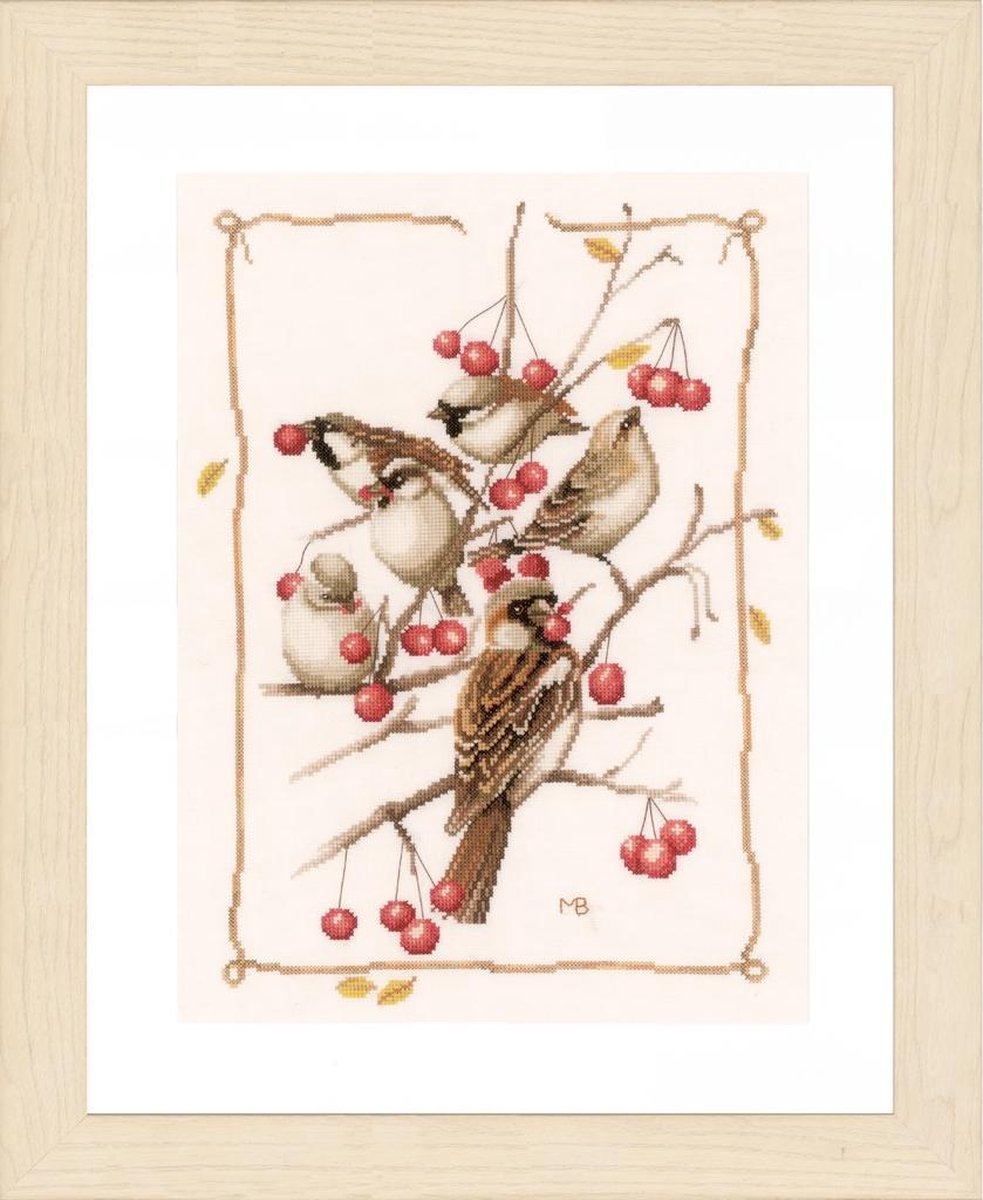 Telpakket kit Huismusjes met rode besjes , Steken: Franse knoop, kruissteek, Spansteek, Stiksteek