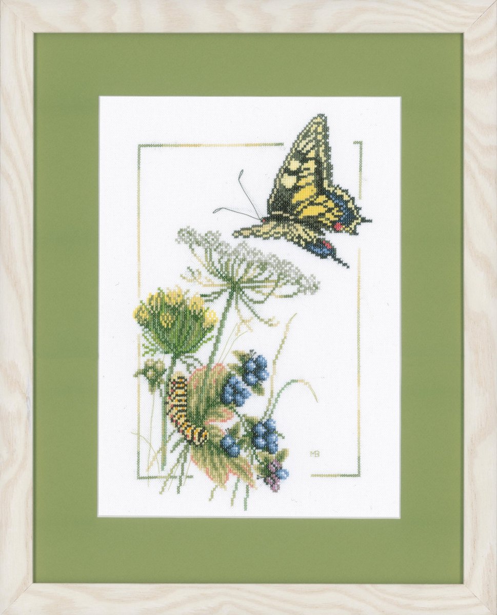 Telpakket kit Vlinder met blauwe bessen , Steken: Franse Knoopsteek, kruissteek, Spansteek, Stiksteek