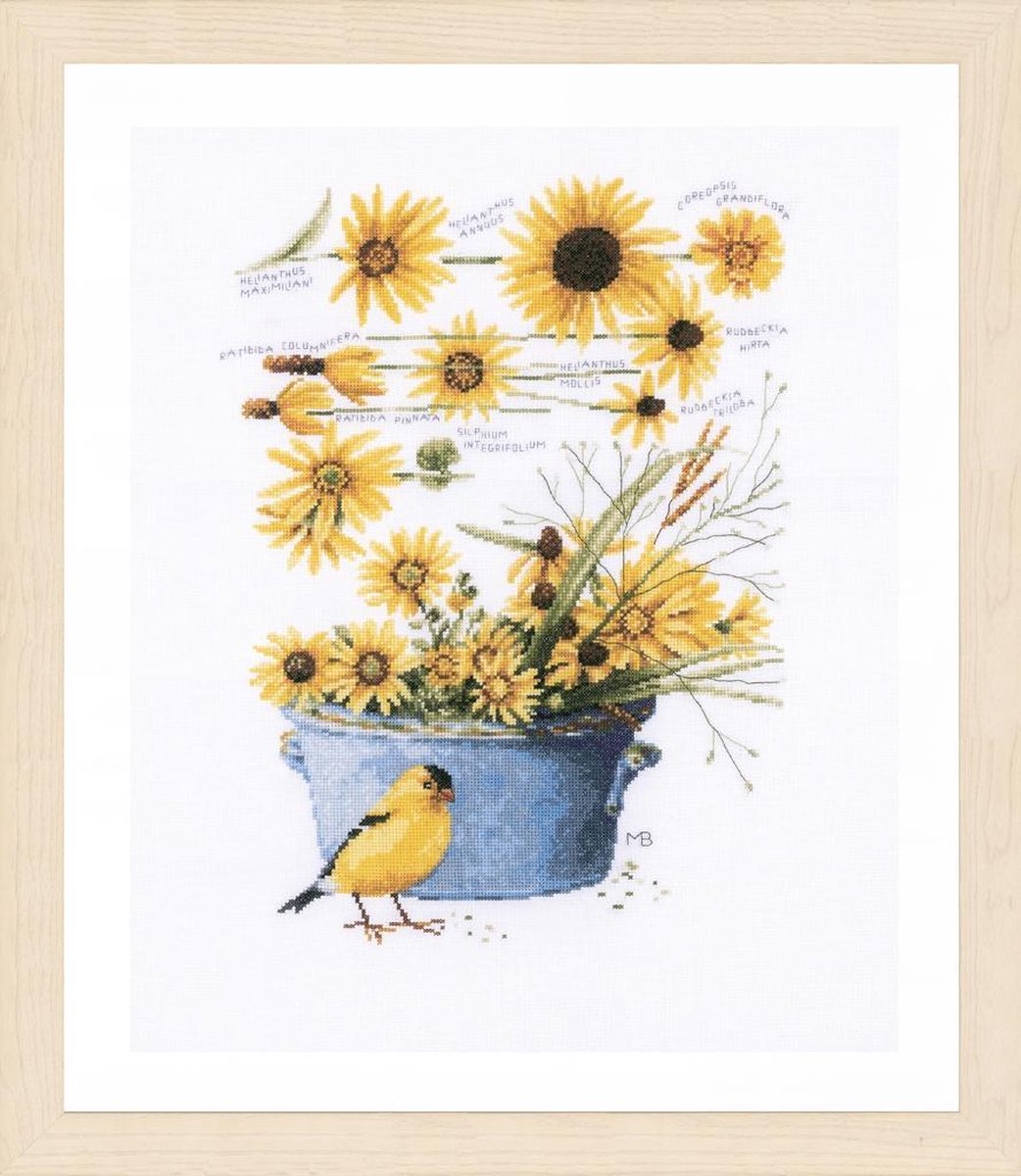 Telpakket kit Zonnebloemen, Steken: Franse knoop, kruissteek, Spansteek, Stiksteek