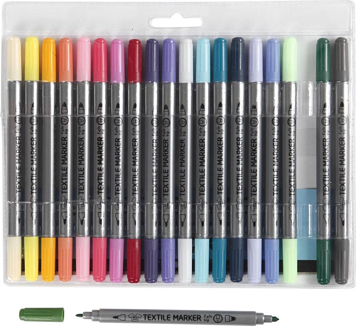Goede kwaliteit, sterke, permanente textielstiften met dubbele punt. Schudden voor gebruik. Na fixatie wasbaar op 40°C Voorafgaand aan gebruik, wordt de kleurafgifte aan de punt verzekerd door een paar schudbewegingen te maken.Hoogwaardige kwaliteit, sterke, permanente textielstiften met dubbele punt. Na fixatie met het strijkijzer wasbaar op 40 °C.