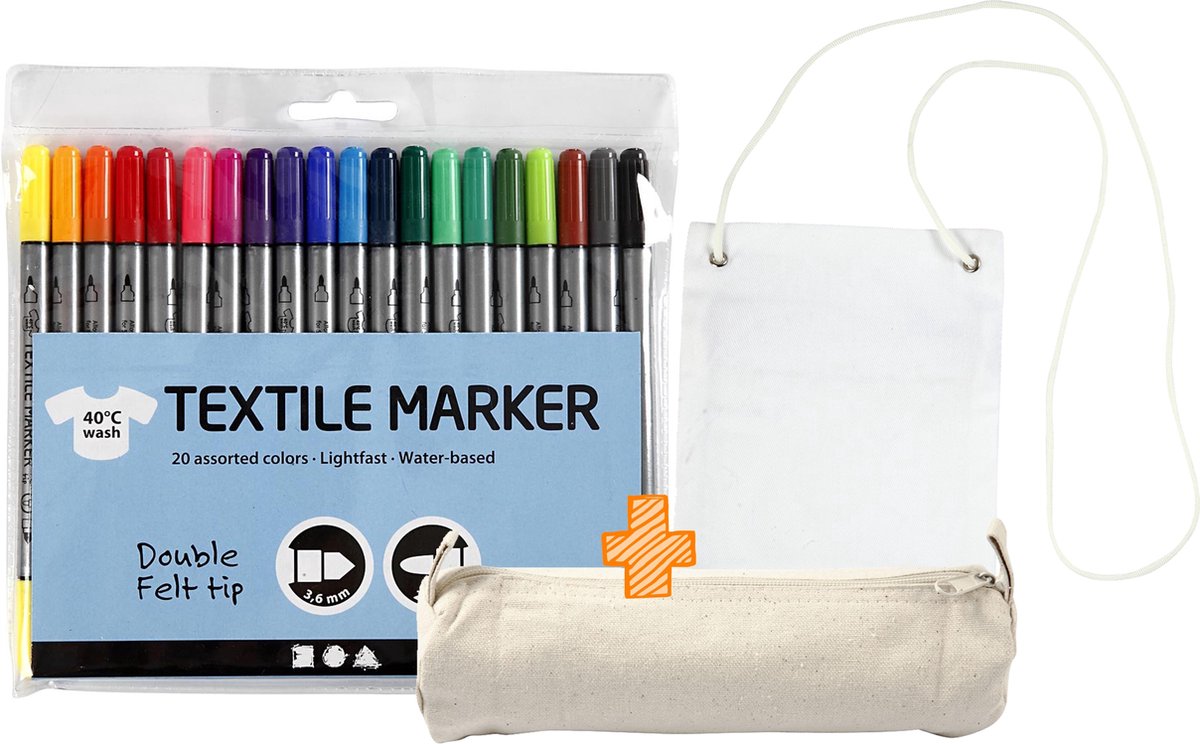 Goede kwaliteit, sterke, permanente textielstiften met dubbele punt. Na fixatie wasbaar op 40°C, 24 stuks in de mooiste kleuren. Samen met een leuke katoenen hangportomonee en een katoenen etui met ritssluiting