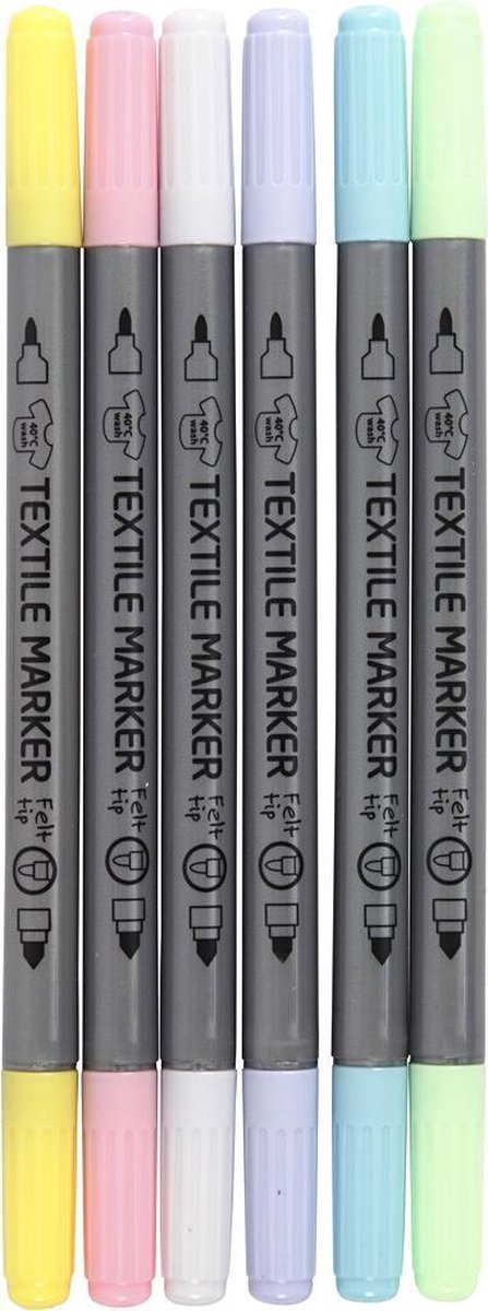 Goede kwaliteit, sterke, permanente textielstiften met dubbele punt. Schudden voor gebruik. Na fixatie wasbaar op 40°C Voorafgaand aan gebruik, wordt de kleurafgifte aan de punt verzekerd door een paar schudbewegingen te maken.Hoogwaardige kwaliteit, sterke, permanente textielstiften met dubbele punt. Na fixatie met het strijkijzer wasbaar op 40 °C.