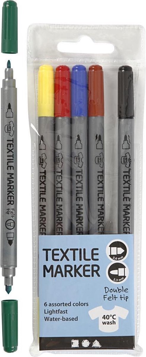Goede kwaliteit, sterke, permanente textielstiften met dubbele punt. Schudden voor gebruik. Na fixatie wasbaar op 40°C Voorafgaand aan gebruik, wordt de kleurafgifte aan de punt verzekerd door een paar schudbewegingen te maken.Goede kwaliteit, sterke, permanente textielstiften met dubbele punt. Na fixatie wasbaar op 40°C.