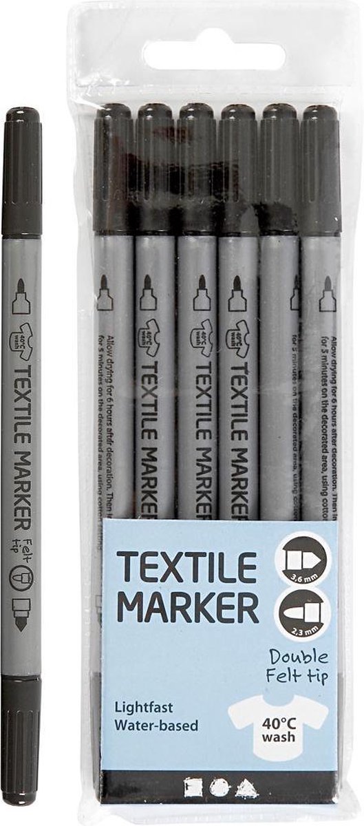 Goede kwaliteit, sterke, permanente textielstiften met dubbele punt. Schudden voor gebruik. Na fixatie wasbaar op 40°C Voorafgaand aan gebruik, wordt de kleurafgifte aan de punt verzekerd door een paar schudbewegingen te maken.Goede kwaliteit, sterke, permanente textielstiften met dubbele punt. Na fixatie wasbaar op 40°C.