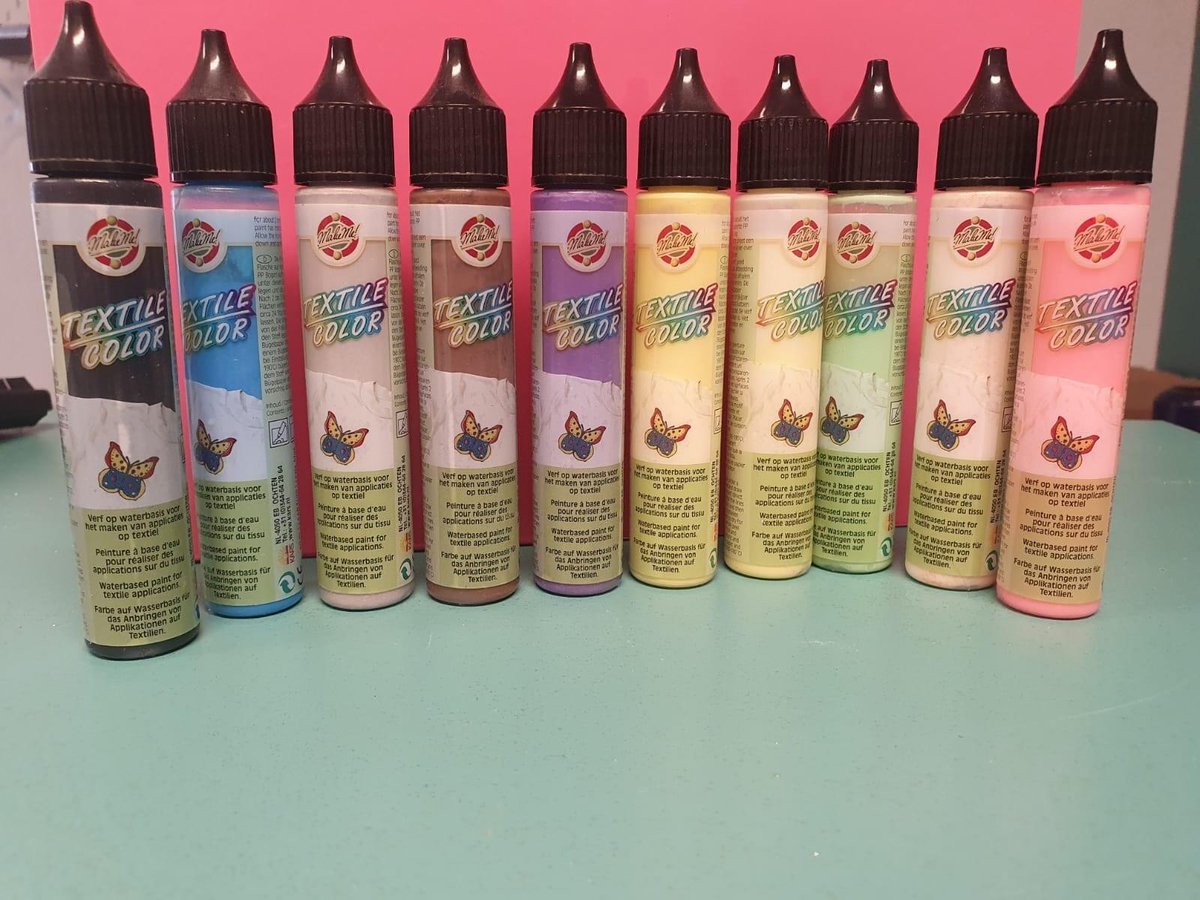 maak je eigen applicaties op textiel! pakket met 10 kleuren random kleuren verf direct vanuit het flesje op een doorzichtige plastic sheet aanbrengen, leg eventueel een voorbeeld onder uw sheeten trek de lijnen over hierna kunt u de afbeelding inkleuren. laat de verf goed drogen ongeveer 24 uur haal de afbeelding voorzichtig van de sheet en plaats hem op uw textiele voorwerp. dek hem af met bakpapier en strijk hem 2 minuten op 180 graden hierdoor versmelt de afbeelding in het textiel. haal het bakpapier eraf na afkoelen van het product u kunt het product wassen op max. 40 graden