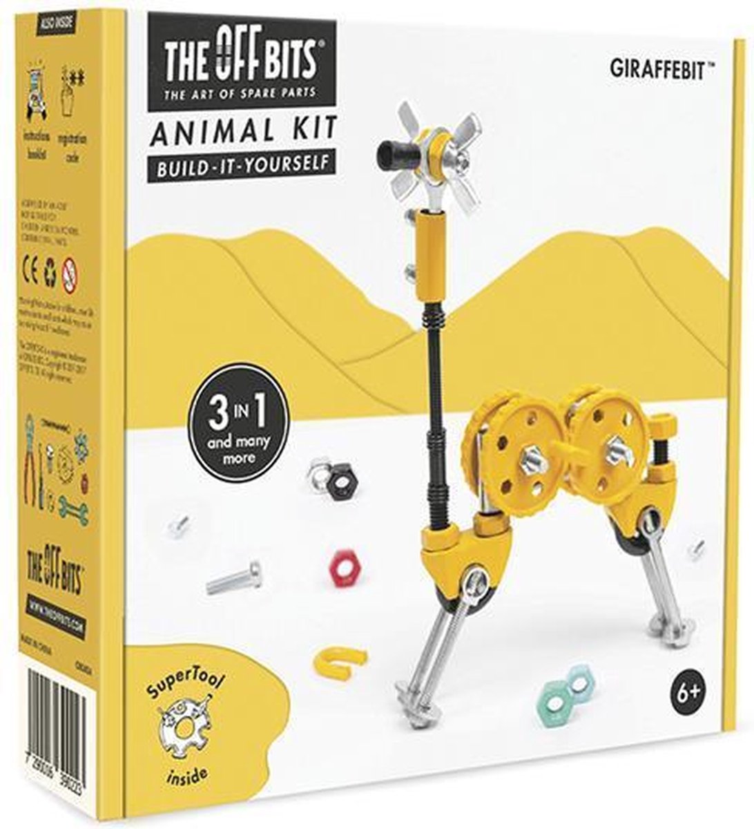 The OFFbits bouwpakket Animal Kit GIRAFFEBIT Met de bouwpakketten van The OFFbits raak je nooit uitgebouwd. Deze 3 in 1-kit bestaat uit maar liefst 60 onderdelen waarmee je drie verschillende voertuigen in elkaar kunt zetten. Combineer meerdere pakketten van The OFFbits met elkaar en ontdek telkens weer nieuwe constructies en figuren. Specificaties: Kleur: geel, zilver Geslacht: junior Materiaal: staal, kunststof Afmetingen verpakking: 15 x 15 x 4 cm (LxBxH) Moeilijkheidsgraad: expert Leeftijd: vanaf 6 jaar Inhoud: 60 Onderdelen 1 Supertool 1 Handleiding