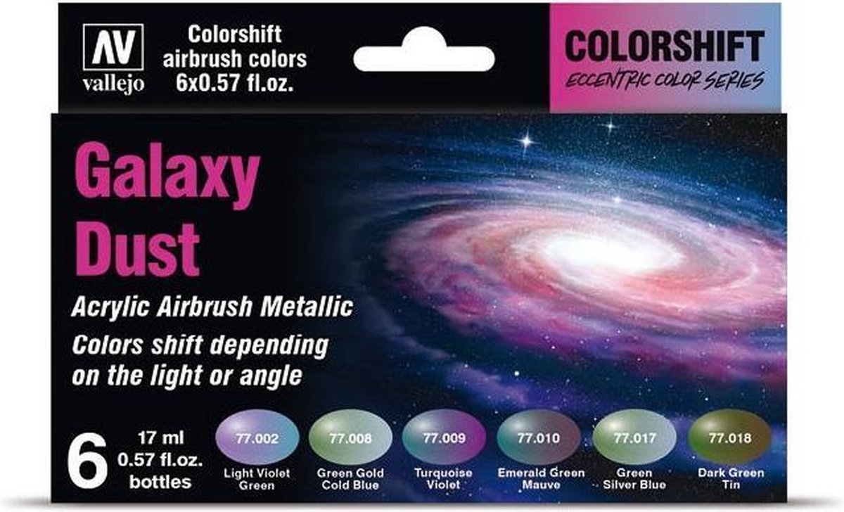De Galaxy Dust-verfset bevat de volgende koude tinten met subtiele chromatische variaties. Bevat 6 The Shifters in potjes van 17ml met eyedropper. De multichromatische Eccentric Colors-pigmenten die worden gebruikt bij de formulering van deze kleuren geven ze een levendige metaalachtige sprankeling, terwijl hun glasachtige coating werkt als een brekend prisma. Elke schilfer vertoont een verscheidenheid aan kleuren, afhankelijk van de beeldhoek en invallend licht; het kleurverschuivingseffect is waarneembaar bij zowel hoog- als laagglanzende toepassingen en in een breed scala aan lichtomstandigheden en wordt versterkt als de kleuren worden aangebracht op een gebogen oppervlak, terwijl de beste effecten worden verkregen over een glanzend zwarte basiskleur. De beste resultaten worden verkregen met airbrush over een glanzende donkere coating. U kunt de nieuwe The Shifters-verven met penseel gebruiken. Verdun de kleuren voor het aanbrengen met een kwast in een aanbevolen hoeveelheid van 4