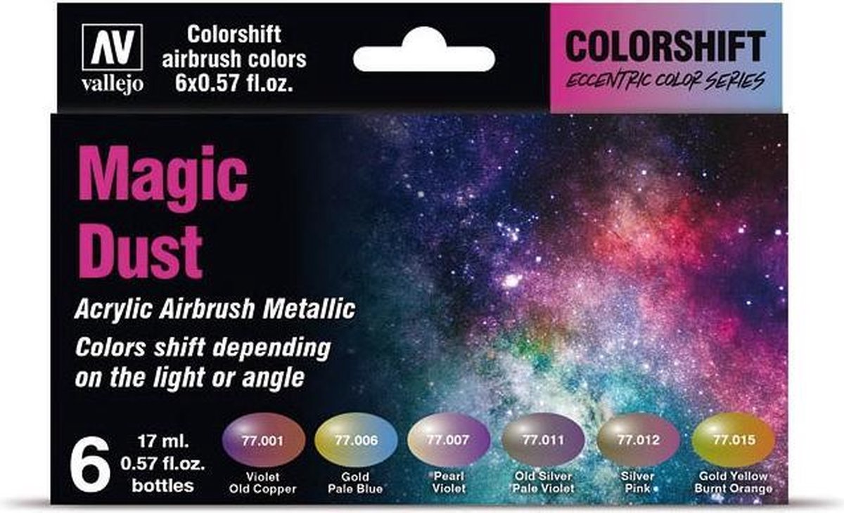 De Magic Dust verfset bevat de volgende chromatische referenties met hoog contrast. Bevat 6 Shifters kleuren in potjes van 17ml met eyedropper. De multichromatische Eccentric Colors-pigmenten die worden gebruikt bij de formulering van deze kleuren geven ze een levendige metaalachtige sprankeling, terwijl hun glasachtige coating werkt als een brekend prisma. Elke schilfer vertoont een verscheidenheid aan kleuren, afhankelijk van de beeldhoek en invallend licht; het kleurverschuivingseffect is waarneembaar bij zowel hoog- als laagglanzende toepassingen en in een breed scala aan lichtomstandigheden en wordt versterkt als de kleuren worden aangebracht op een gebogen oppervlak, terwijl de beste effecten worden verkregen over een glanzend zwarte basiskleur. De beste resultaten worden verkregen met airbrush over een glanzende donkere coating. U kunt de nieuwe The Shifters-verven met penseel gebruiken. Verdun de kleuren voor het aanbrengen met een kwast in een aanbevolen hoeveelheid van 4
