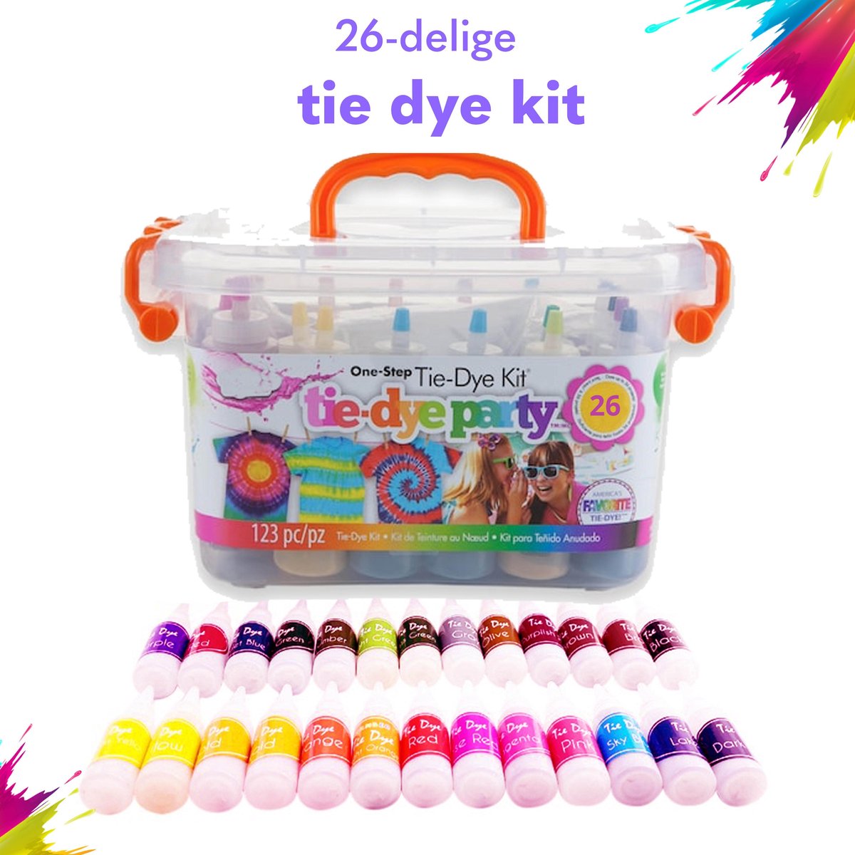 Tie Dye Kit - 26 kleuren Voordeelpakket! Wil jij jouw oude kleren of kussenslopen pimpen, wacht niet langer! De 26 prachtige kleuren in deze set kunnen elk kledingstuk omtoveren tot een feestje. Met de bijgeleverde elastieken kan je verschillende patronen aanbrengen en al jou fantasie erop loslaten. De bijgeleverde schorten en handschoenen zorgen ervoor dat jijzelf en jouw kleding schoon blijven tijdens het creëren van je tie dye creatie. Voordelen van de Tie Dye Set ? Alle benodigdheden in één kit! ? Geen vieze handen of kleren door de bijgeleverde beschermmaterialen ? Individuele flesjes voor elke kleur, dus geen geknoei met overgieten ? De kleuren zijn helder en blijven goed zichtbaar in de stof ? Voordeelpakket Wat zit er in het Tie Dye Voordeelpakket? ?? 26 kleuren ?? 26 flesjes met kleursticker ?? 26 zakjes kleurpoeder (meng met water) ?? 120 rubberen elastiekjes ?? 10 paar handschoenen ?? 1 plastic grondbeschermer ?? 5 plastic schorten Stappenplan van de Tie Dye Set Doe wat