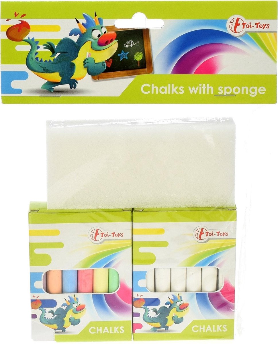 Toi-Toys krijtjesset met spons Krijtjes kan je voor vrijwel alles gebruiken: stoepen, tekeningen en natuurlijk krijtborden. Deze set bestaat uit zowel kleurige krijtjes als witte krijtjes. Om je foutjes uit te kunnen vegen zit er een handige spons bij! Specificaties: Geslacht: junior Kleur: multicolor, wit Materiaal: krijt Leeftijd: vanaf 2 jaar Inhoud: 1 Spons 1 Pakje a 12 kleurrijke krijten 1 Pakje a 12 witte krijten
