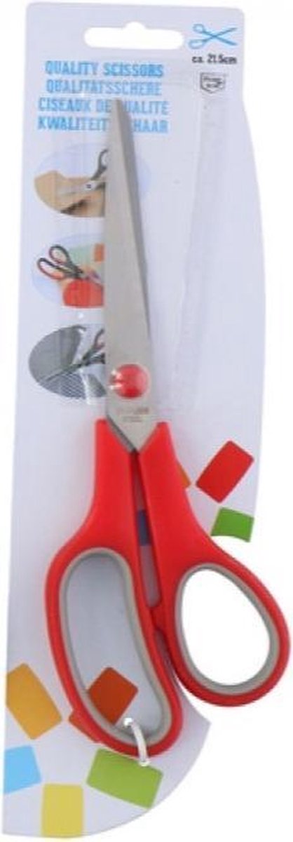 TOM schaar Deze superhandige schaar is erg makkelijk in het gebruik en is 13 cm lang en leverbaar in de kleuren: zwart, rood en geel. Specificaties: Geslacht: junior, unisex Materiaal: roestvrij staal/kunststof Kleur: rood Leeftijd: vanaf 8 jaar Afmeting: 27 x 1 x 8 cm