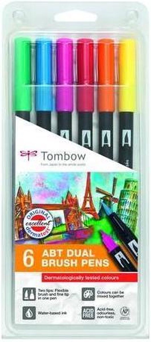 Een set met 6 schitterende pastelkleuren. 6 ABT Dual Brushpennen van Tombow. In deze set zitten de volgende kleuren: 055 process yellow 296 green 493 reflex blue 725 rhodamine red 856 Chinese red 925 Scarlet ?De Tombow ABT Dual Brush Pen is een ideale stift voor handlettering, kleuren voor volwassenen, kaarten maken, motieven maken, tekenen van strips en illustraties en nog veel meer. De Brush Pen is voorzien van twee verschillende punten; een fijne punt voor het tekenen van precieze lijnen en een penseelpunt om grotere vlakken mee te kleuren. Maar deze punt is ook perfect voor handlettering. De penseelpunt zorgt voor de karakteristieke dunne en dikke lijnen in je handschrift. De 108 kleuren zijn op basis van water en kunnen dus goed met elkaar en met water gemengd worden. Hierdoor worden ook aquareltechnieken mogelijk. Zuur- en geurvrij. Verkrijgbaar in maar liefst 107 schitterende kleuren en een kleurloze blender! Tevens verkrijgbaar in diverse sets en een blending kit.