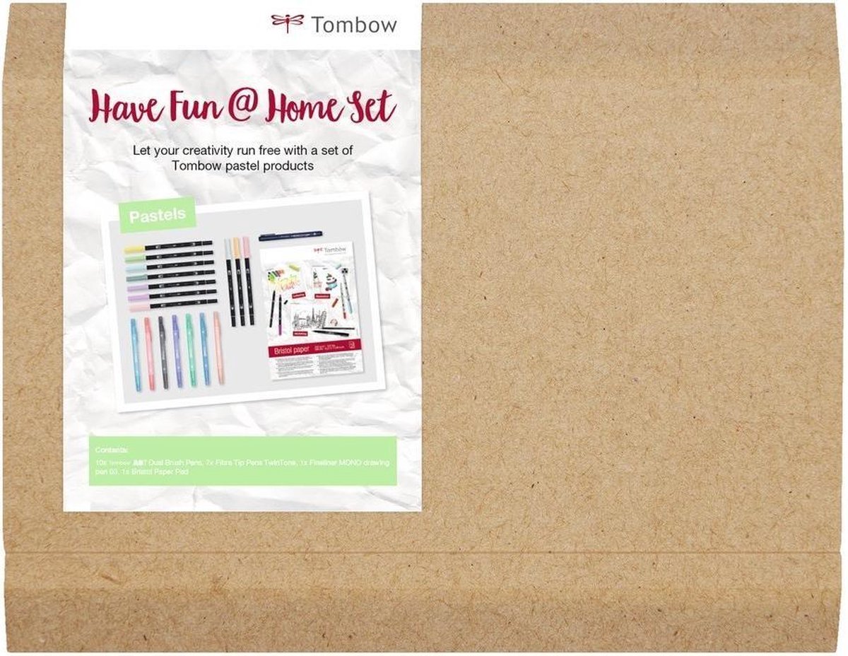 #stayathome is op ieders lippen in deze ongewone tijden. Om de tijd thuis creatief door te brengen, hebben we de beste Tombow pastelproducten samengesteld, zodat u uw klant online kunt aanspreken en ondersteunen, trouw aan het motto: "Laat je creativiteit de vrije loop met een set van Tombow pastelproducten" Producten: - 10x ABT Dual Brush Pen met flexibele penseelpunt voor grote, krachtige letters en fijne punt voor details; kleuren kunnen worden gemengd en geschilderd met water - 7x Viltstift TwinTone met twee punten voor lijnen met verschillende breedte; kleuren op waterbasis - drukken op de meeste soorten papier niet door - 1x Fineliner MONO drawing pen voor nauwkeurige lijntekeningen; lijnbreedte 03 (ca. 0.35 mm); perfect voor het tekenen met liniaal of sjabloon door de lange metalen punt - 1x Tekenblok Bristol DIN A4: glad papier, hagelwit; hoge dekkracht en zuurvrij; geschikt voor Brush Pens op waterbasis, markers op alcoholbasis, fineliner, potlood en airbrush