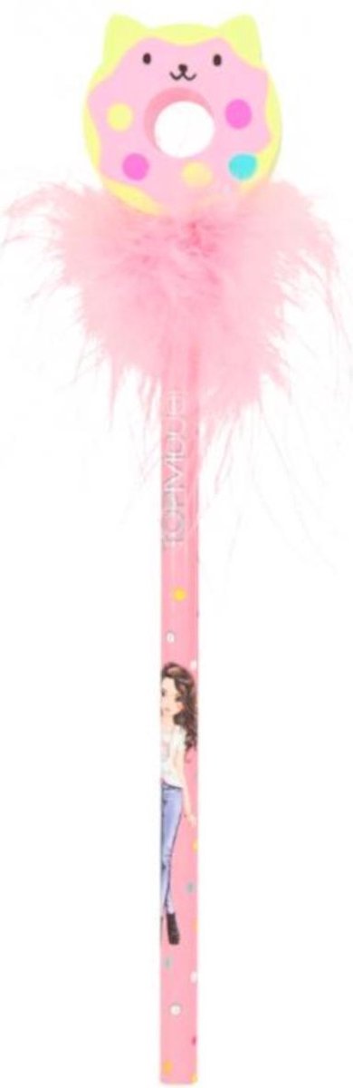 Top Model Donut potlood Dit potlood is bijna te mooi om te gebruiken! Het potlood met hardheid HB is aan de buitenkant afgewerkt met mooie Top Model motieven. Aan de bovenkant bevindt zich een bonte topper met veren en een zoete gum in de vorm van een donut! Specificaties: Kleur: roze Geslacht: meisjes Materiaal: hout Lengte: 20 cm Leeftijd: vanaf 4 jaar