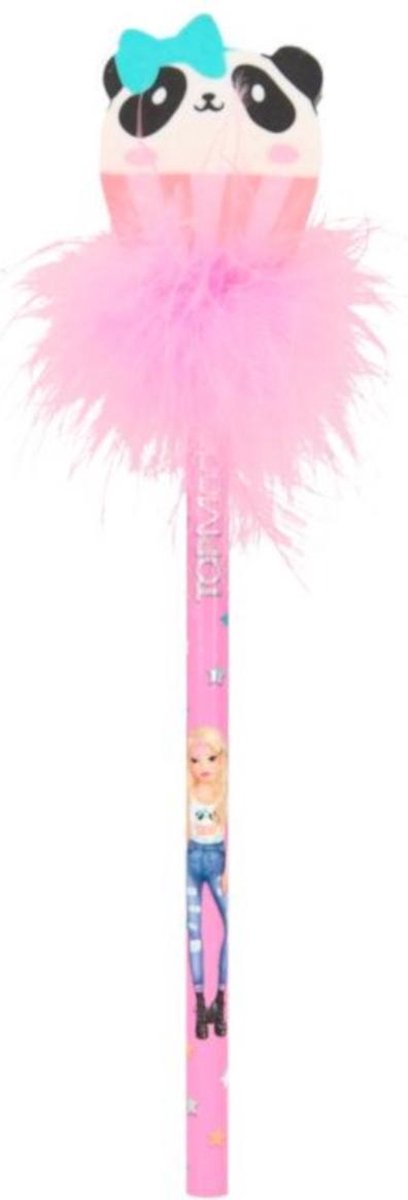 Top Model Panda potlood Dit potlood is bijna te mooi om te gebruiken! Het potlood met hardheid HB is aan de buitenkant afgewerkt met mooie Top Model motieven. Aan de bovenkant bevindt zich een bonte topper met veren en een zoete gum in de vorm van een panda! Specificaties: Kleur: roze Geslacht: meisjes Materiaal: hout Lengte: 20 cm Leeftijd: vanaf 4 jaar