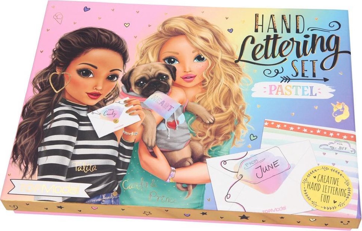 Van dit pakket worden de fans van handlettering pas echt gelukkig!! De TOPModel Brievenbox Handlettering zit boordevol mooie spulletjes om mee te handletteren: - tien vellen briefpapier - tien enveloppen - drie stickervellen (1x zilver, 2x goud) - vijf kaarten - vier rollen tape met een houder - vier stiften (drie dubbele stiften, een magic handlettering stift) - twee sjablonen - een boekje met heel veel coole handlettering voorbeelden en handleiding. 100% trend - 100% plezier!