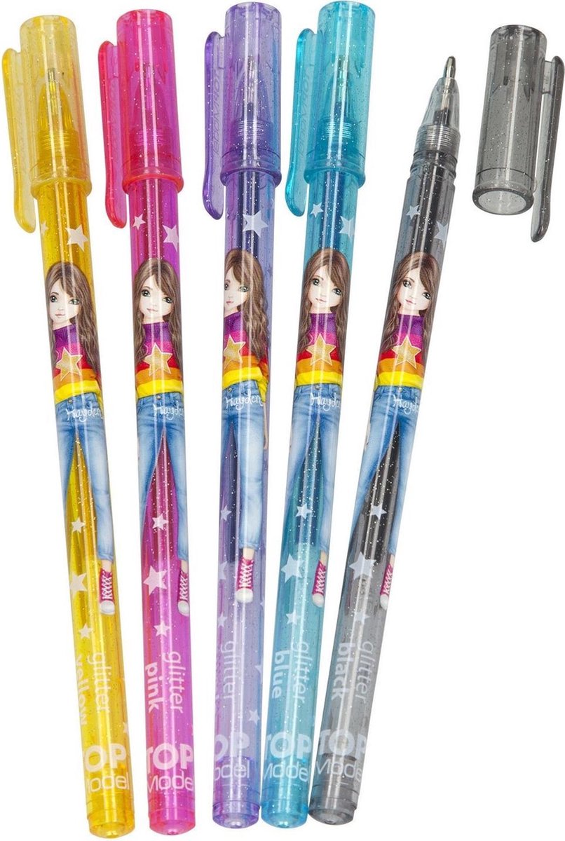 Dit zijn niet zo maar gelpennen. Deze vijf verschillende kleuren bevatten speciale glitter inkt. Elke tekst of elke tekening zal van het papier af shinen! De TOPModel gelpennen set bevat de kleuren: geel, roze, paars, blauw en zwart.