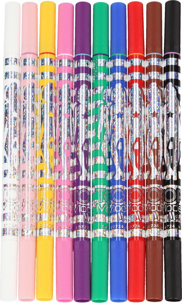 De TOPModel Magic Viltstiften zijn supermooie viltstiften met 2 kanten. De ene kant van de TOPModel Magic Viltstift is om zachte vlakke stukken in te kleuren en met de andere kant kun je mooie lijntjes trekken, omdat hij puntiger is. Maar wat misschien wel het leukste is van de TOPModel Magic Viltstiften!?!? Heb je een mooie tekening gekleurd, dan kun je de kleuren veranderen met de witte viltstift!! Kleur met de witte viltstift over de kleuren heen en de kleuren veranderen elk in een eigen andere kleur!! Wil je weten welke kleur het wordt? Dat zie je aan het dunne randje vlak onder de dop van de gekleurde stift.