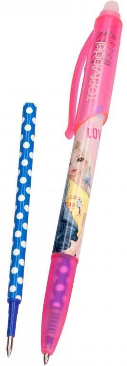 Zo handig: schijven met een zachte gelpen en het ook nog eens kunnen uitgummen alsof het een potlood is! En het beste: de pen met een prachtige TOPModel print en ingebouwde gum zien er ook nog eens heel cool uit! Verkrijgbaar in de kleuren paars en roze. De vulling is blauw. Wow!