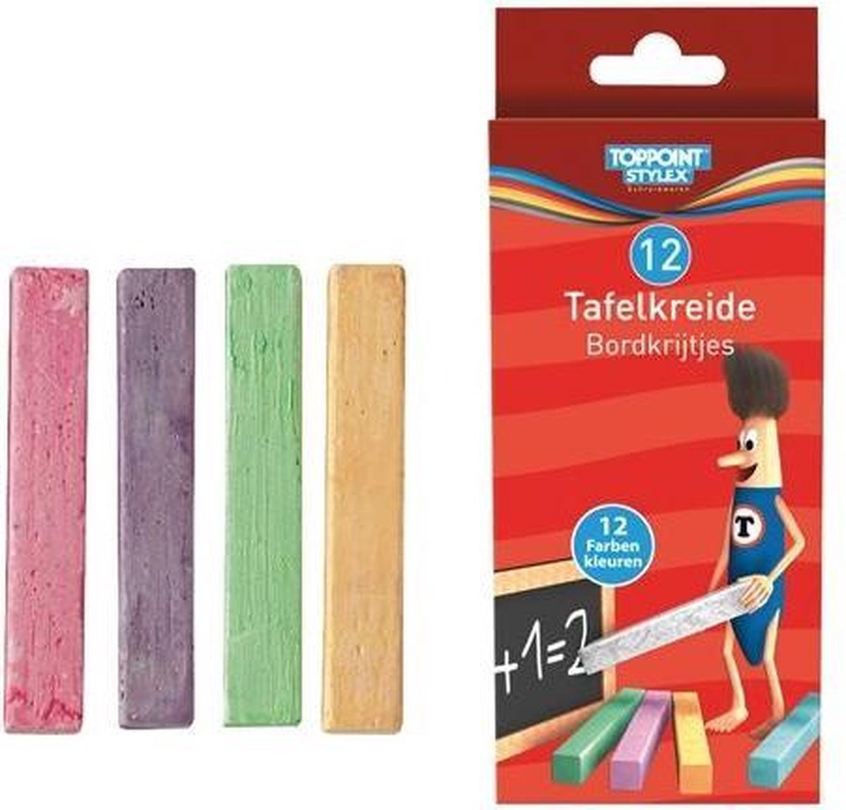 12 gekleurde bordkrijtjes in kartonnen doosje met Eurolock. Wordt uitsluitend per 12 doosjes geleverd.