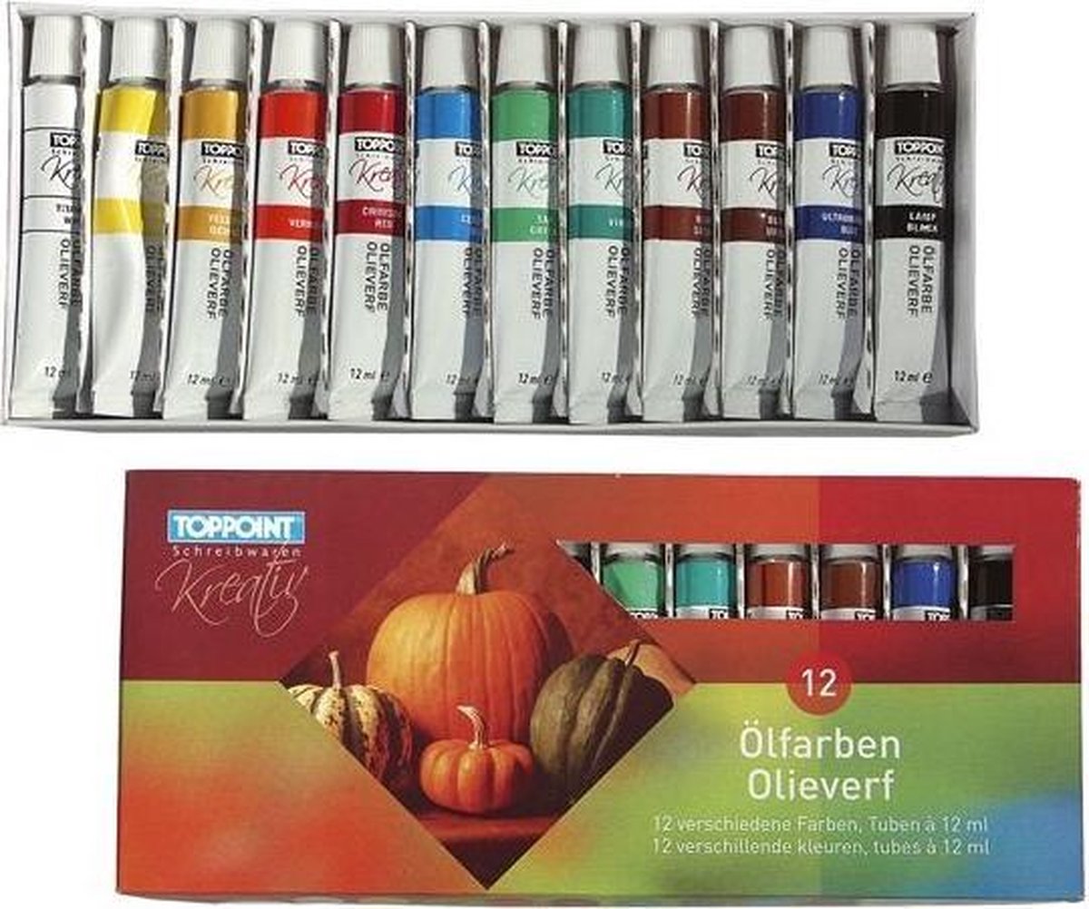 TopPoint olieverf. 12 tubes met elk 12 ml inhoud, in verschillende kleuren.