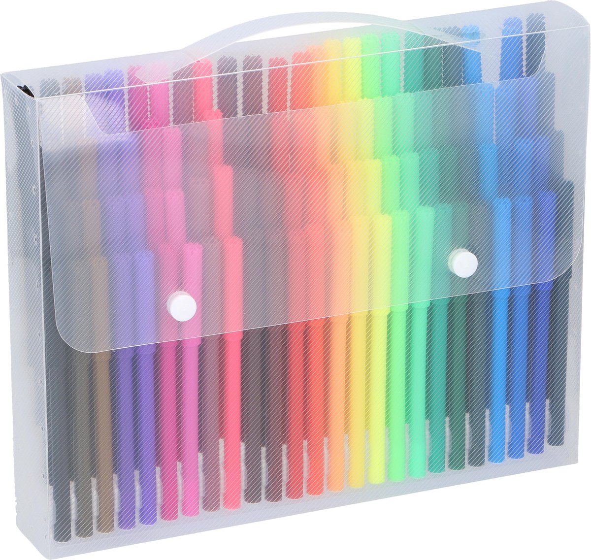 Wil je creativiteit stimuleren? Veel kinderen vinden tekenen leuk. Ze vertellen verhalen met hun tekeningen, brengen ervaringen over op papier. Daarnaast is kleuren goed voor hun creatieve ontwikkeling en fijne motoriek. Al vanaf peuterleeftijd kunnen kinderen zich uitleven met kleurtjes. Ook oudere kinderen tekenen graag. Met deze set van 100 viltstiften stimuleer je creativiteit. De stiften komen in een koffer met handvat en druksluiting waar je ze in kan bewaren en ook gemakkelijk mee kan nemen. Het koffertje is transparant, zodat je aan de buitenkant al goed de kleur van iedere stift kan zien. Per kleur zitten 4 viltstiften in de koffer. De totaal 25 kleuren geven uren tekenplezier. Alle veelvoorkomende kleuren zitten in deze stiftenset: zwart, bruin, paars, roze, rood, oranje, geel, groen en blauw.