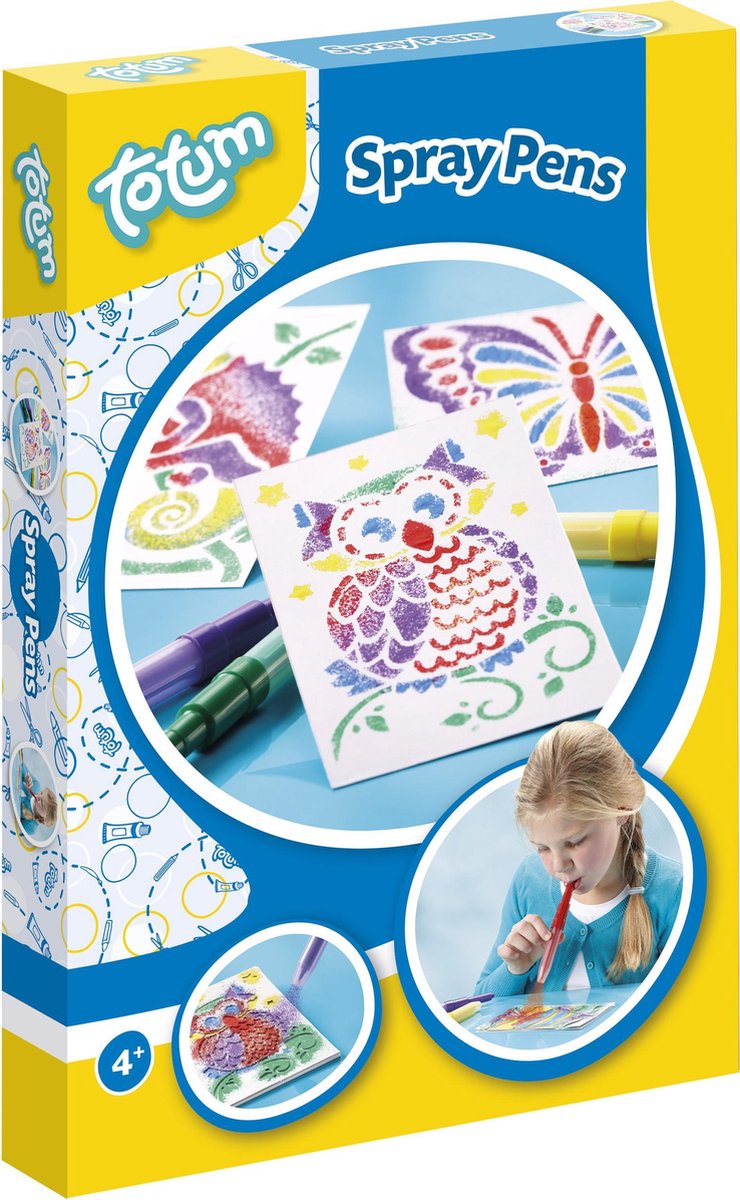 Maak mooie schilderijtjes met de Totum Spraypens. De set bevat mooie herbruikbare sjablonen, waardoor urenlang knutselplezier gegarandeerd is. Inhoud: - 5 spraypennen - 4 sjablonen - wit papier - gebruiksaanwijzing Knutselen doe je met Totum!