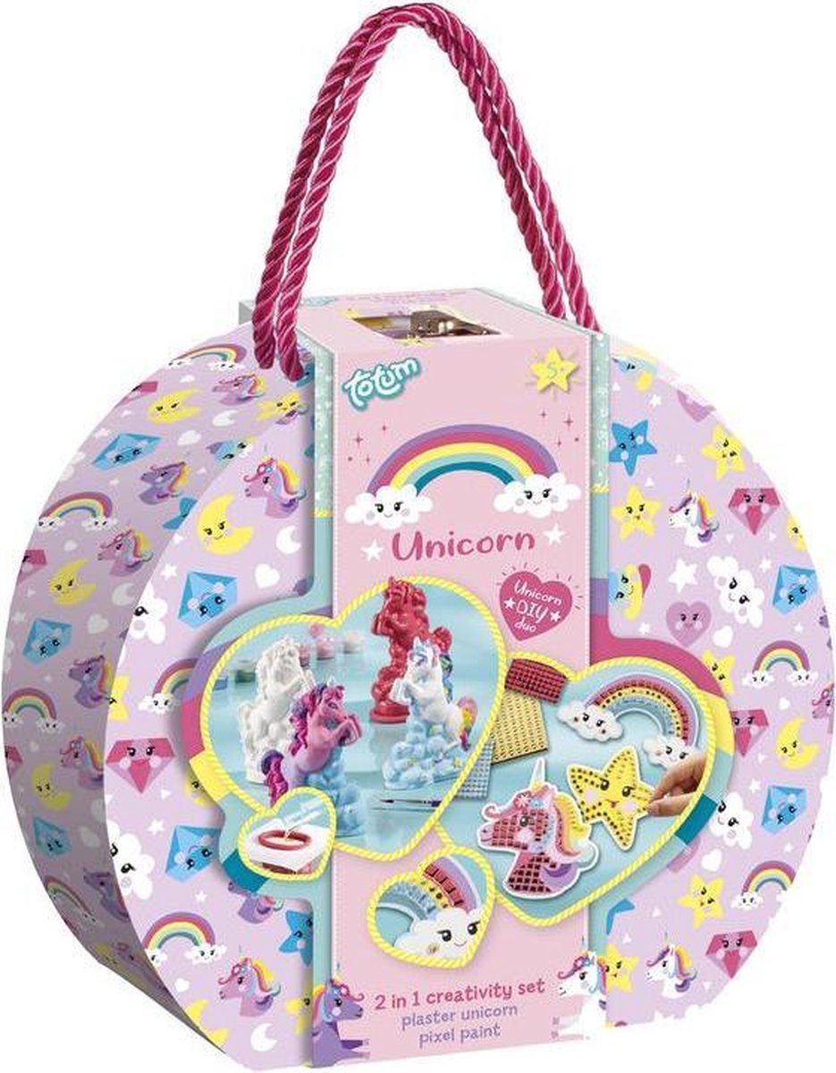 Totum Unicorn 2 in 1 koffer gipsgieten & pixel paintDit trendy unicorn geschenkkoffertje bevat twee creatieve activiteiten : unicorn figuren gieten met gips en verven en pixel paint figuren maken. 2 favoriete sets in een supermooi herbruikbaar koffertje