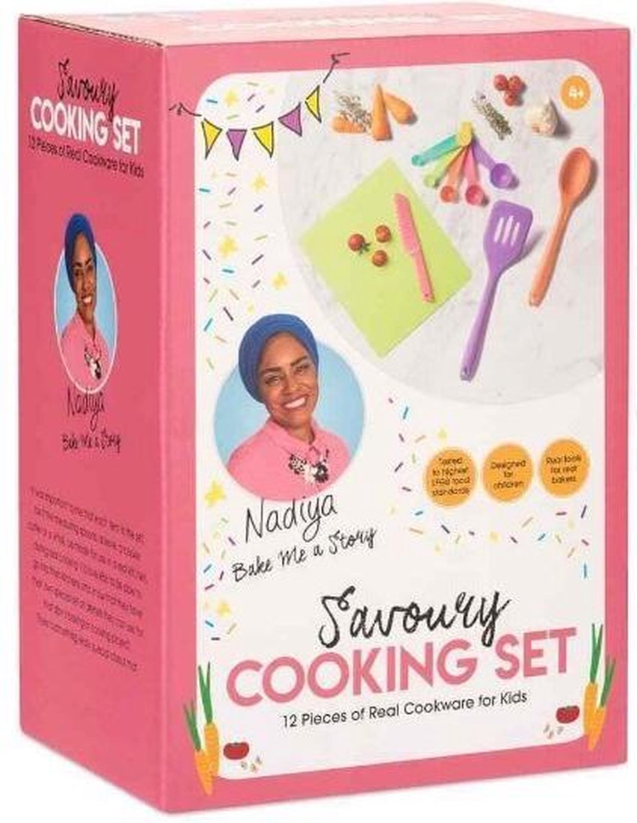 Toyrific Nadiya's hartig bak en kook set Wil jij samen met jouw kindjes bakken? Dan is deze hartige bak en kook set van Toyrific perfect. De set is ontworpen met 'The Great British Bake Off' winnaar Nadiya Hussain. De set bestaat uit recepten en kookgerei. Specificaties: Kleur: multicolor Geslacht: junior Materiaal: kunststof, siliconen Leeftijd: vanaf 6 jaar Inhoud: 1 Veiligheidsmes 1 Visplakje 1 Menglepel 1 Snijmat 1 Mengkom (magnetronveilig) 1 Set maatlepels 1 Schort 5 Receptenkaarten