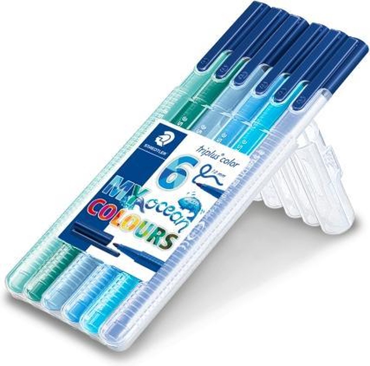 STAEDTLER triplus color 323 driekantige viltstift – Ocean colours • Ergonomische, driekantige viltstift om ontspannen en zacht te schrijven en te kleuren. • Stabiele, drukbestendige punt. • Geventileerde dop. DRY SAFE - kan dagenlang open liggen zonder uitdrogen (test ISO 554). • Inkt op waterbasis. Uitwasbaar uit de meeste textielsoorten. • Lijnbreedte ca. 1,0 mm. • Opstelbare box bevat 6 geassorteerde “Ocean” kleuren