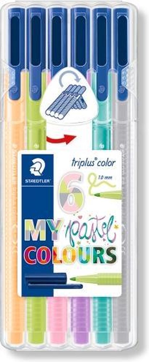 STAEDTLER triplus color 323 driekantige viltstift – Pastel colours • Ergonomische, driekantige viltstift om ontspannen en zacht te schrijven en te kleuren. • Stabiele, drukbestendige punt. • Geventileerde dop. DRY SAFE - kan dagenlang open liggen zonder uitdrogen (test ISO 554). • Inkt op waterbasis. Uitwasbaar uit de meeste textielsoorten. • Lijnbreedte ca. 1,0 mm. • Opstelbare box bevat 6 geassorteerde pastelkleuren