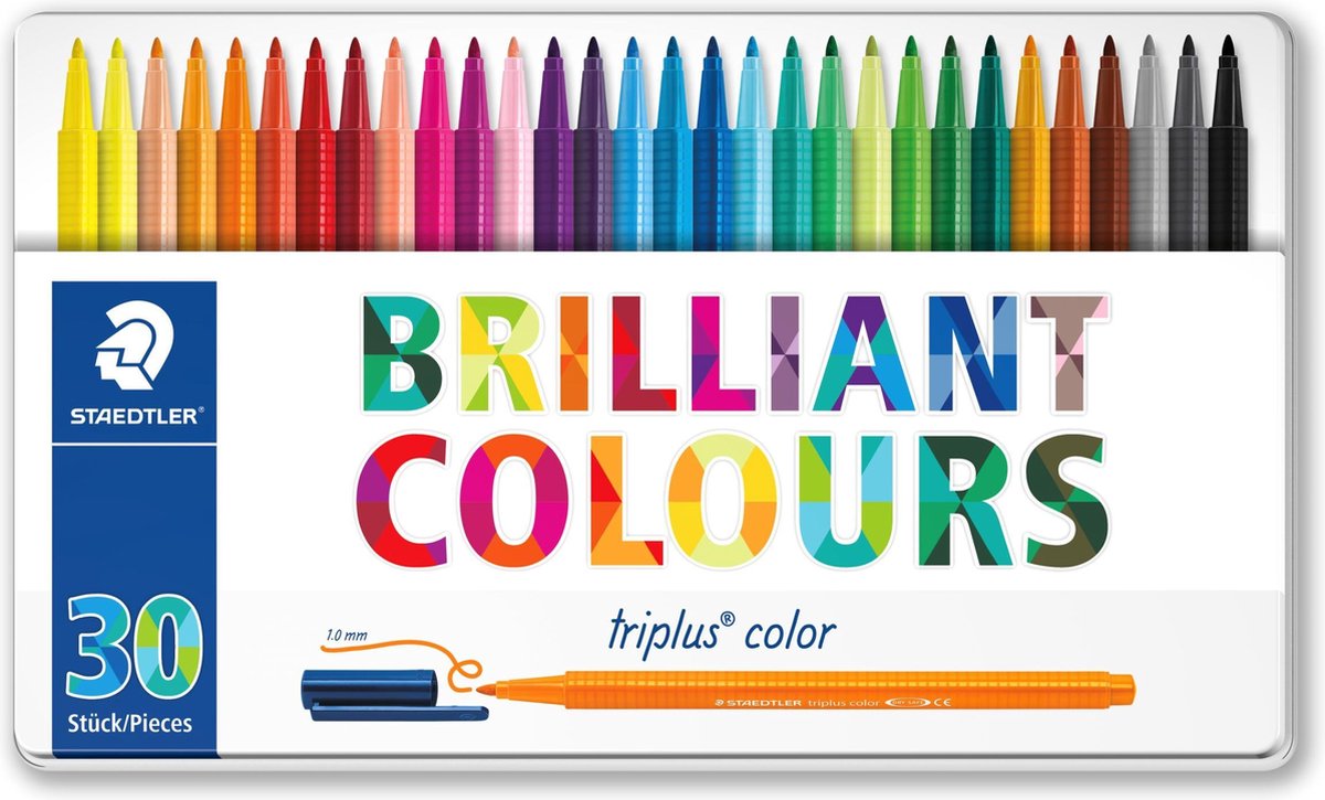 STAEDTLER triplus color - Metalen etui met 30 kleuren Brilliant Colours editie Ergonomische, driekantige viltstift om ontspannen en zacht te kleuren Stabiele, drukbestendige punt Geventileerde dop DRY SAFE - kan dagenlang open liggen zonder uitdrogen Inkt op waterbasis Uitwasbaar uit de meeste textielsoorten PP lichaam en dop voor een lange levensduur Lijnbreedte ca. 1,0 mm De Mix&Match formule zorgt ervoor dat de kleuren perfect overeenstemmen met die van de triplus fineliner
