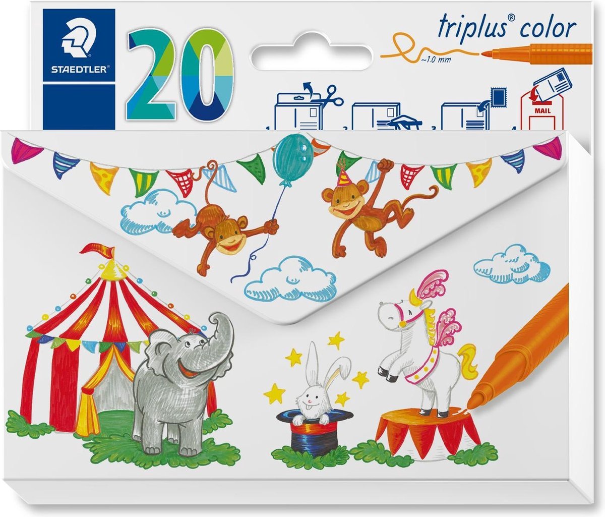 STAEDTLER triplus color kleurstift – Postkaart set met 20 kleuren • Ergonomische, driekantige viltstift om ontspannen en zacht te schrijven en te kleuren. • Stabiele, drukbestendige punt. • Geventileerde dop. • DRY SAFE - kan dagenlang open liggen zonder uitdrogen (test ISO 554). • Inkt op waterbasis. • Uitwasbaar uit de meeste textielsoorten. • Lijnbreedte ca. 1,0 mm. • Postpakket kan meteen opgestuurd worden met de post: achteraan kunnen de adresgegevens ingevuld worden • Een ideaal geschenk voor kinderen op kamp