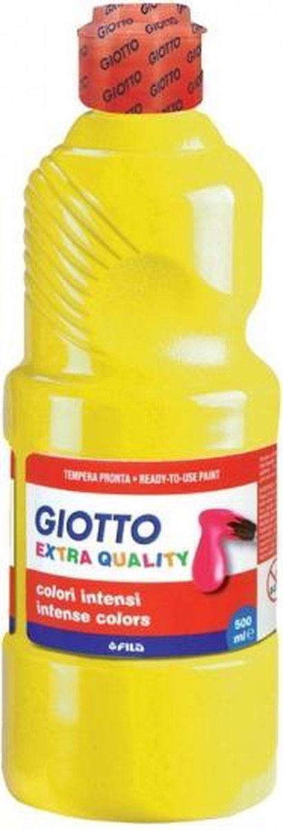 Tube gele verf 500 ml. Een tube dikke gele plakkaatverf met een inhoud van ongeveer 500 ml.