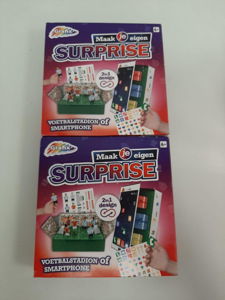 Twee leuke pakketen waarmee je je eigen surprise mee kunt knutsellen. De pakketen zijn te gebruiken voor een telefoon surprise of een voetbalstadion surprise. Van karton.