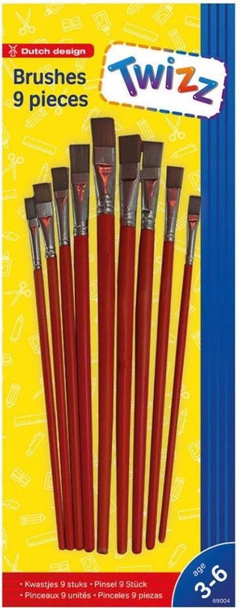 Twizz kwastjes Maak de mooiste kunstwerken met deze negen Twizz Kwastjes. De zachte kwasten zijn voorzien van een rode, kunststof steel. De langste kwast is 25 centimeter lang. Specificaties: Kleur: rood Geslacht: junior Materiaal: kunststof Afmeting artikel: 31 x 12 cm Leeftijd: 3 - 6 jaar Inhoud: 9 Kwastjes variërend van 19 tot 25 cm lang