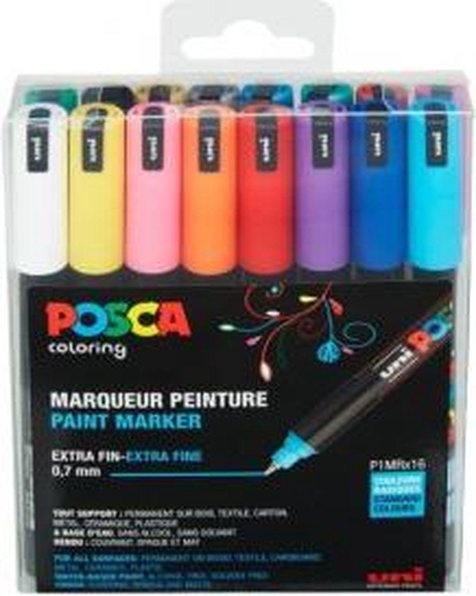 Posca set van 16 x PC1MR markers, geschikt voor de meeste toepassingen. Permanent op hout, textiel, karton, metaal, keramiek en plastic. Uitwisbaar op gladde oppervlakken zoals glas. Op metaal, plastic en geglazuurd aardewerk moet de creatie gefixeerd worden met een fixatielak. Kenmerken – Dikte: 0,7 mm – Op waterbasis – Bevat geen alcohol of oplosmiddelen – Dekkend, ondoorzichtig en mat Deze set bevat de volgende kleuren: Lichtblauw, donkerblauw, violet, rood, oranje, roze, geel, wit, metallic roze, metallic rood, metallic groen, metallic blauw, zilver, goud, zwart, donkergroen.